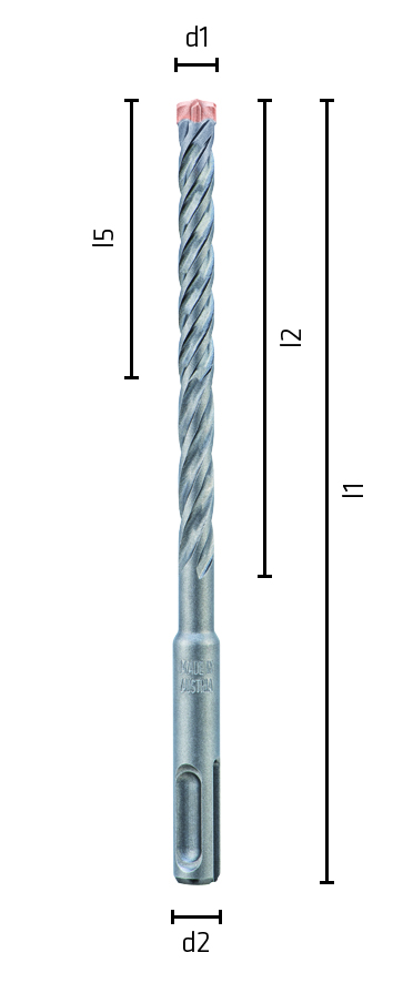 SDS-plus krachtige boor met 4 hardmetalen snijkanten en nieuw progressief spiraalontwerp met deuvellengte-indicator. Probleemloos boren in gewapend beton, trillingsvrije loop en snelle verwijdering van boorstof.