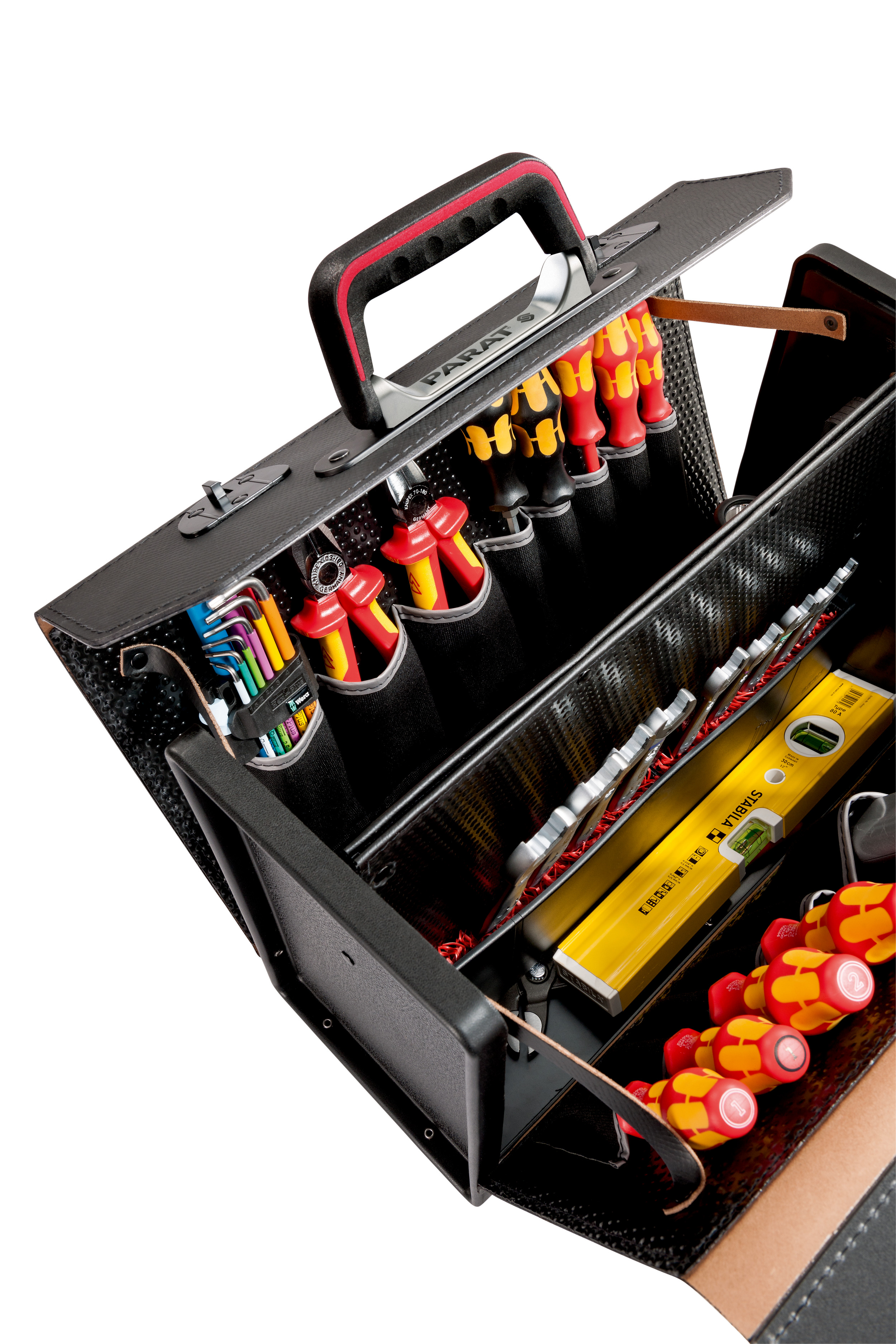 De Topline Plus gereedschapstas van PARAT, ontwikkeld door deskundige gebruikers, biedt duurzaamheid en veelzijdigheid voor dagelijks gebruik. Gemaakt van extra sterk reliëfleer, beschermt het tegen krassen en stoten, en met een gewicht van ongeveer 3 kg en een volume van 25 liter, biedt het voldoende ruimte voor meer dan 30 gereedschappen. Met 16 insteekvakken en CP-7 beugels op de middenwand, biedt het handige toegang tot gereedschappen tijdens het werk. De PARAT-handgreep en verstelbare schouderriem zorgen voor comfortabel transport.