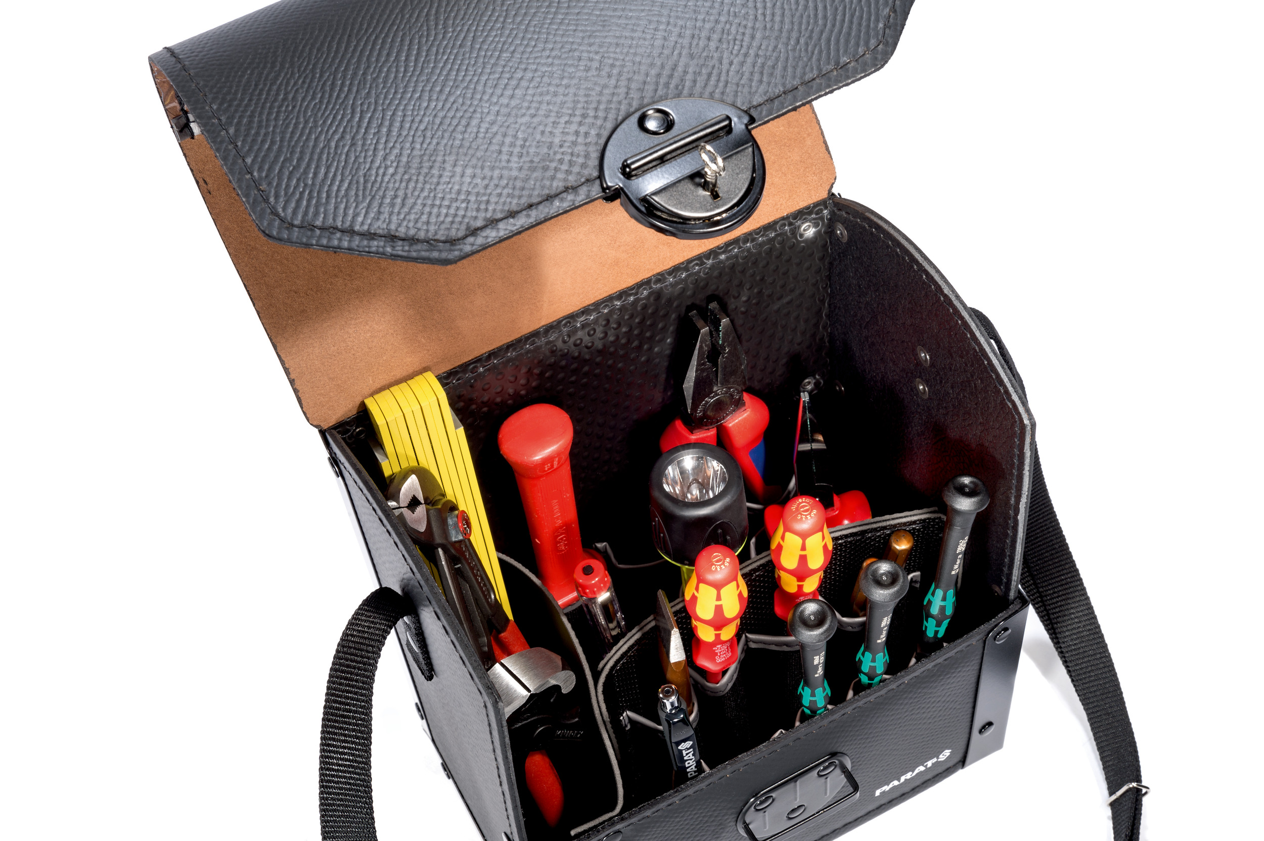 De TOP literine Mini, gemaakt van hoogwaardig zwart leer, is vormvast en zeer robuust dankzij de ingebouwde Aluminium versterking. Met 17 verschillende inzetinsteekvakken houdt het gereedschap georganiseerd en altijd binnen handbereik. Een transparante clip in het deksel houdt belangrijke documenten op hun plaats. Het paraat- slot zorgt voor makkelijke toegang en sluiting, terwijl de verstelbare draagriem zorgt voor comfortabel en individueel dragen tijdens werkopdrachten.
