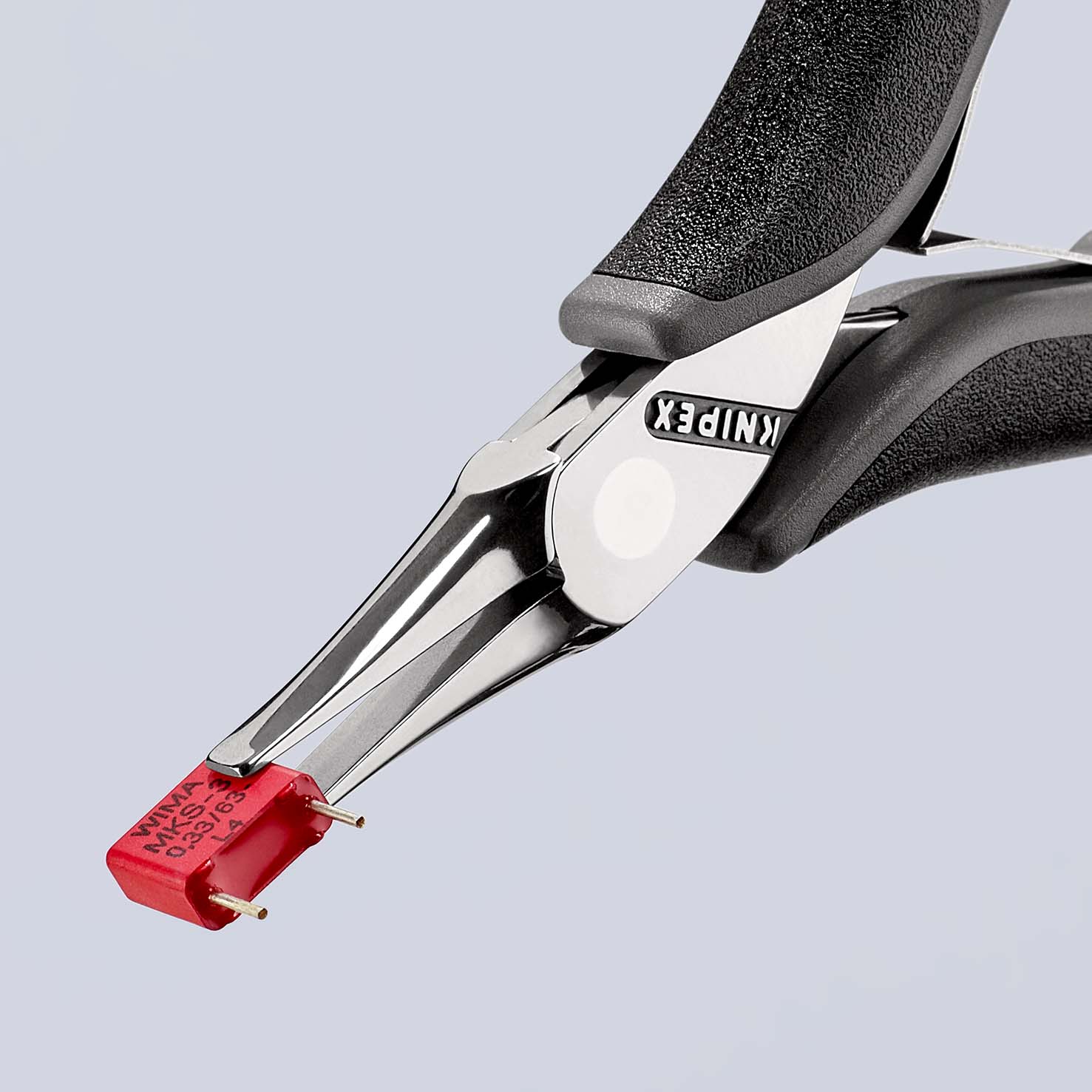 Elektronica-grijptang ESD precisietangen voor fijne montagewerkzaamheden bijv. in elektronica en fijne mechanica. voor grijpen, klemmen en buigen. uitvoering elektrisch afleidend - dissipatief. Doorgestoken precisiescharnier. Glad geslepen grijpvlakken. Kanten zorgvuldig ontbraamd. Soepele, dubbele veer, waardoor de tang makkelijk en gelijkmatig opent. De spiegelpolijsting biedt samen met een fijne oliefilm een optimale bescherming tegen roest - geen storingen in het schakelcircuit door wegspringende chroomsplinters. Benen met tweekleurige meer-componentengrepen zwart/grijs. platte, brede bekken. - Beklengte (B): 22,5 mm - Bekdikte (scharnier) (D): 6,5 mm - Puntbreedte (E): 2,0 mm - Tip Thickness (F): 4,0 mm - Kopbreedte (A): 11,0 mm - ESD: ja.