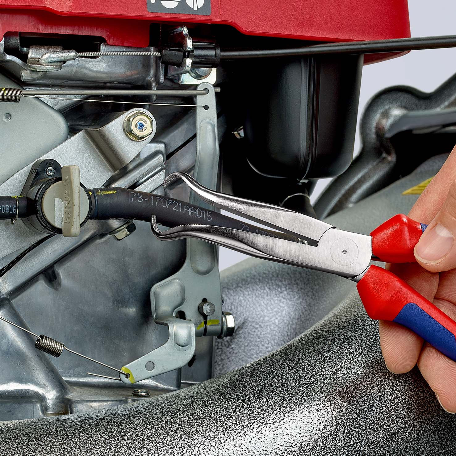 Mechanicatang Uiterst buigvaste punten van de tang. 45° gebogen, halfronde, lange bekken, speciaal voor het grijpen van bougiestekkers en ronde delen (bougiestekker-trektang). - Bekdikte (scharnier) (T1): 9,5 mm - Tip Thickness (T2): 2,5 mm - Beklengte (L3): 73,0 mm - Kopbreedte (W3): 17,5 mm - Kophoek: 45.