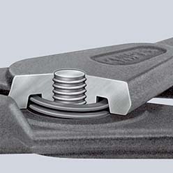 Precisie-borgveertang zeer belastbaar vooral bij langdurig gebruik (gaat tot 10 x langer mee t.o.v. de gewone borgveertangen). Met ingezette punten voor veilig werken. Grote contactvlakken bij de punten: geen verdraaiing van de ringen, eenvoudige montage. Precies, soepel lopend geschroefd scharnier. Openingsveer ligt in het scharnier, voor verlies gewaarborgd. Grepen bekleed met anti-slip kunststof. met openingsbegrenzer (instelbaar door aanslag). instelling door middel van zeskantschroef. ideaal voor serieproductie, omdat effectief vermeden wordt dat de ringen zich uitzetten.