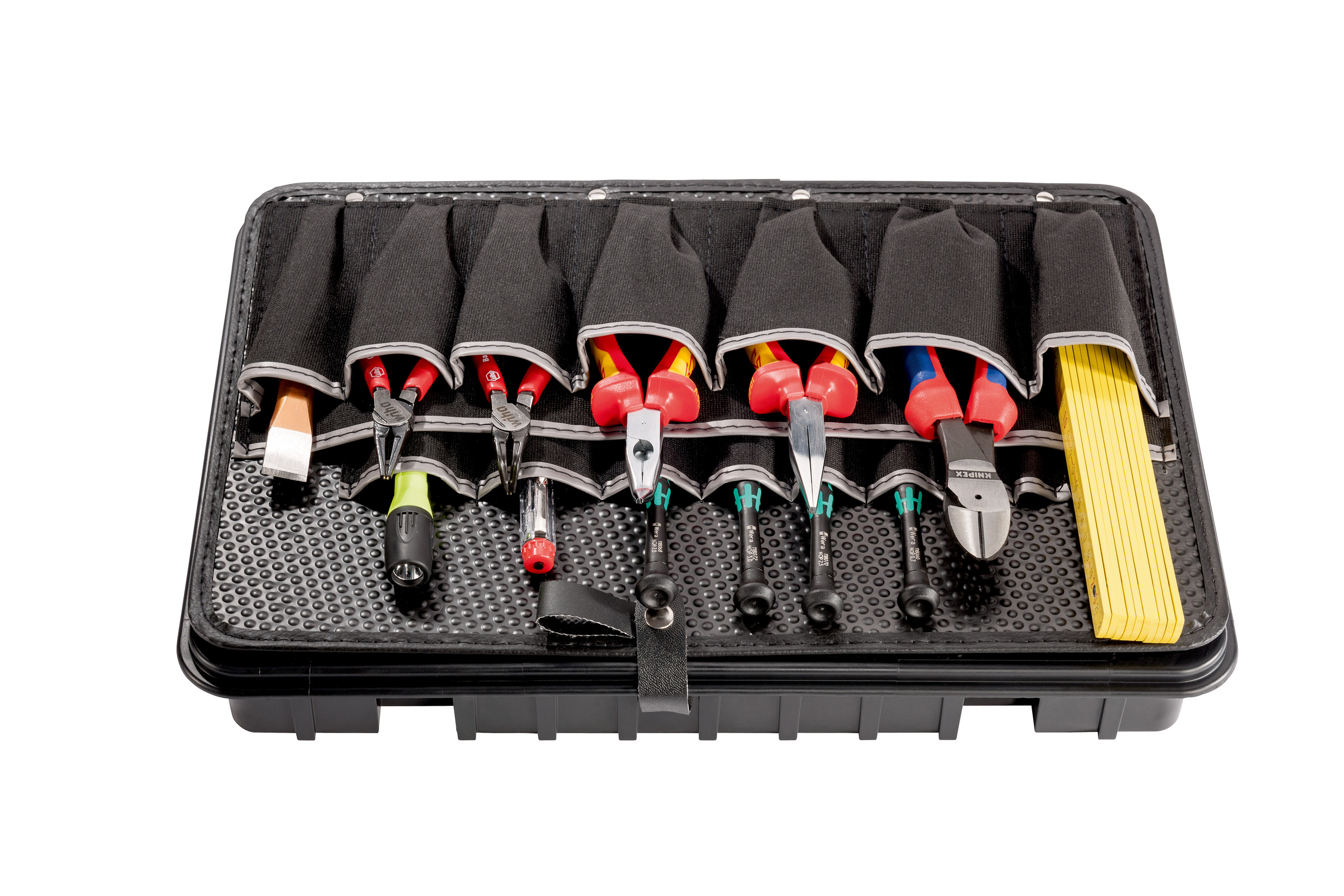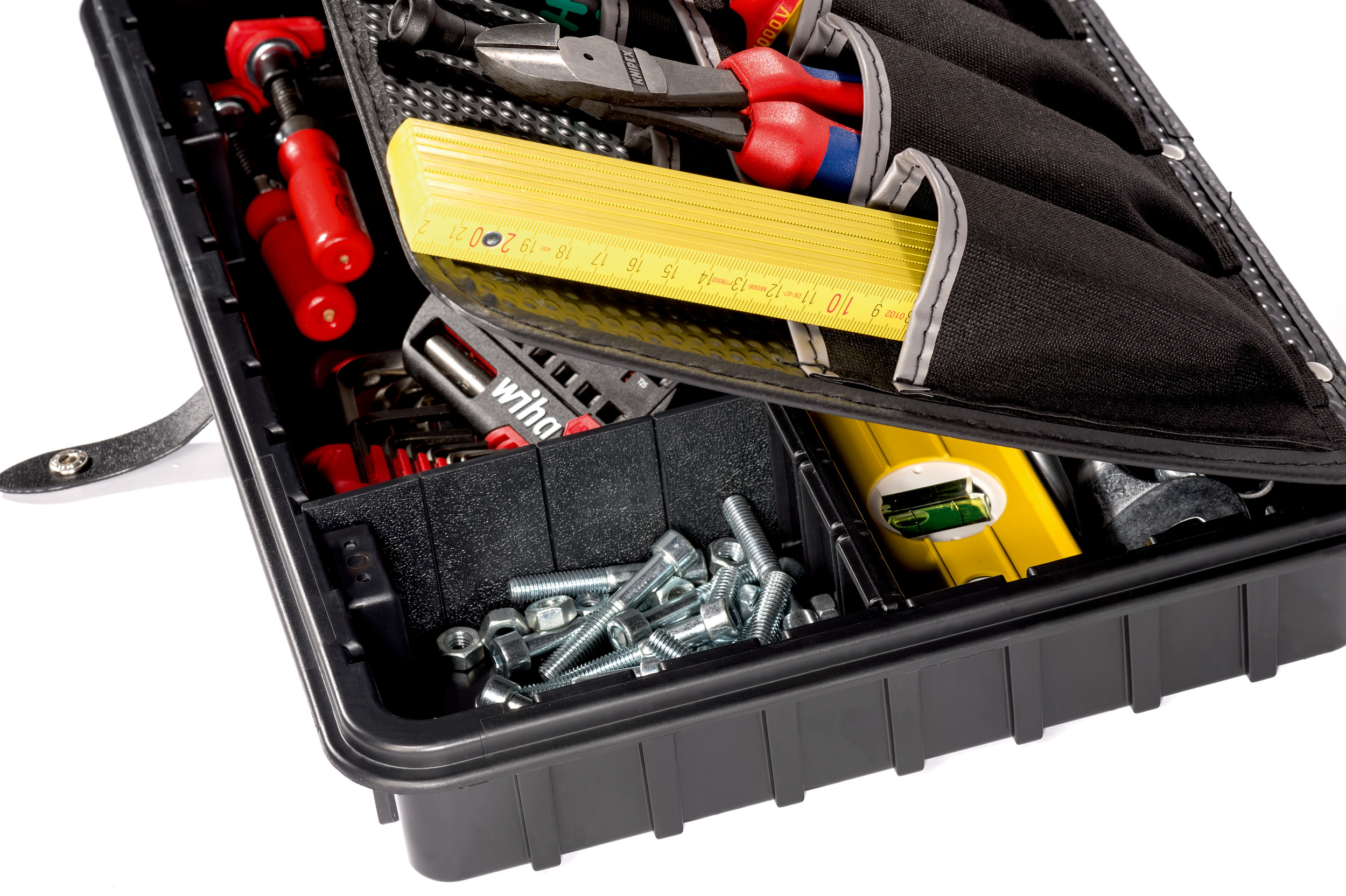 De hoogwaardige zwarte bodemschaal gemaakt van ABS-plastic zorgt voor systeem in de gereedschapszaak. Accessoires en gereedschappen kunnen duidelijk worden gesorteerd en getransporteerd naar een van de 15 pluggen.