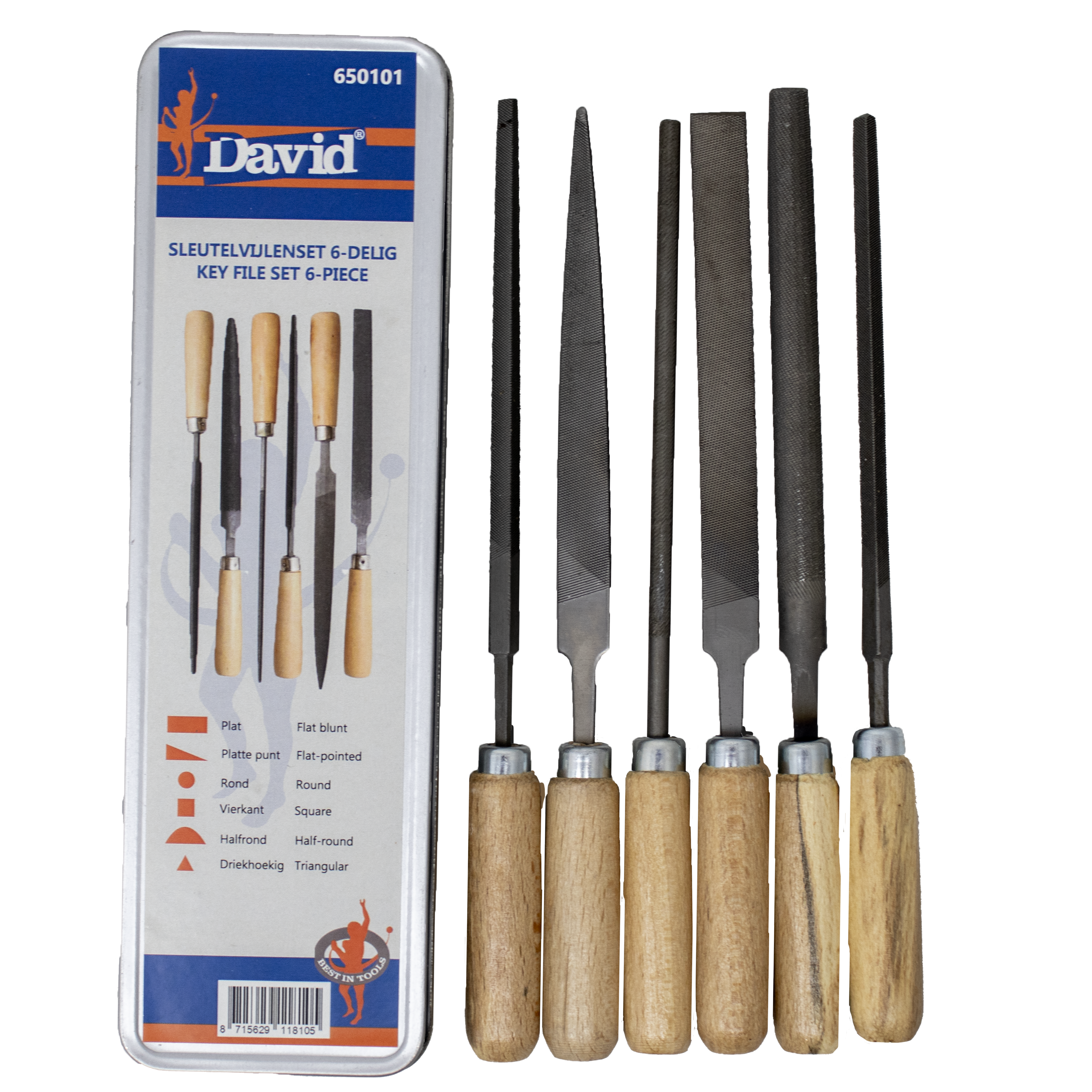 De DAVID sleutelvijlen set is een complete 6-delige set van hoogwaardige vijlen, verpakt in een stevig blik. Met houten hechten voor een comfortabele grip zijn deze vijlen ideaal voor licht en nauwkeurig vijlwerk. De set bevat diverse vormen, zodat u voor elke klus de juiste vijl bij de hand heeft. Perfect voor het fijn bewerken van metaal, hout en andere materialen.