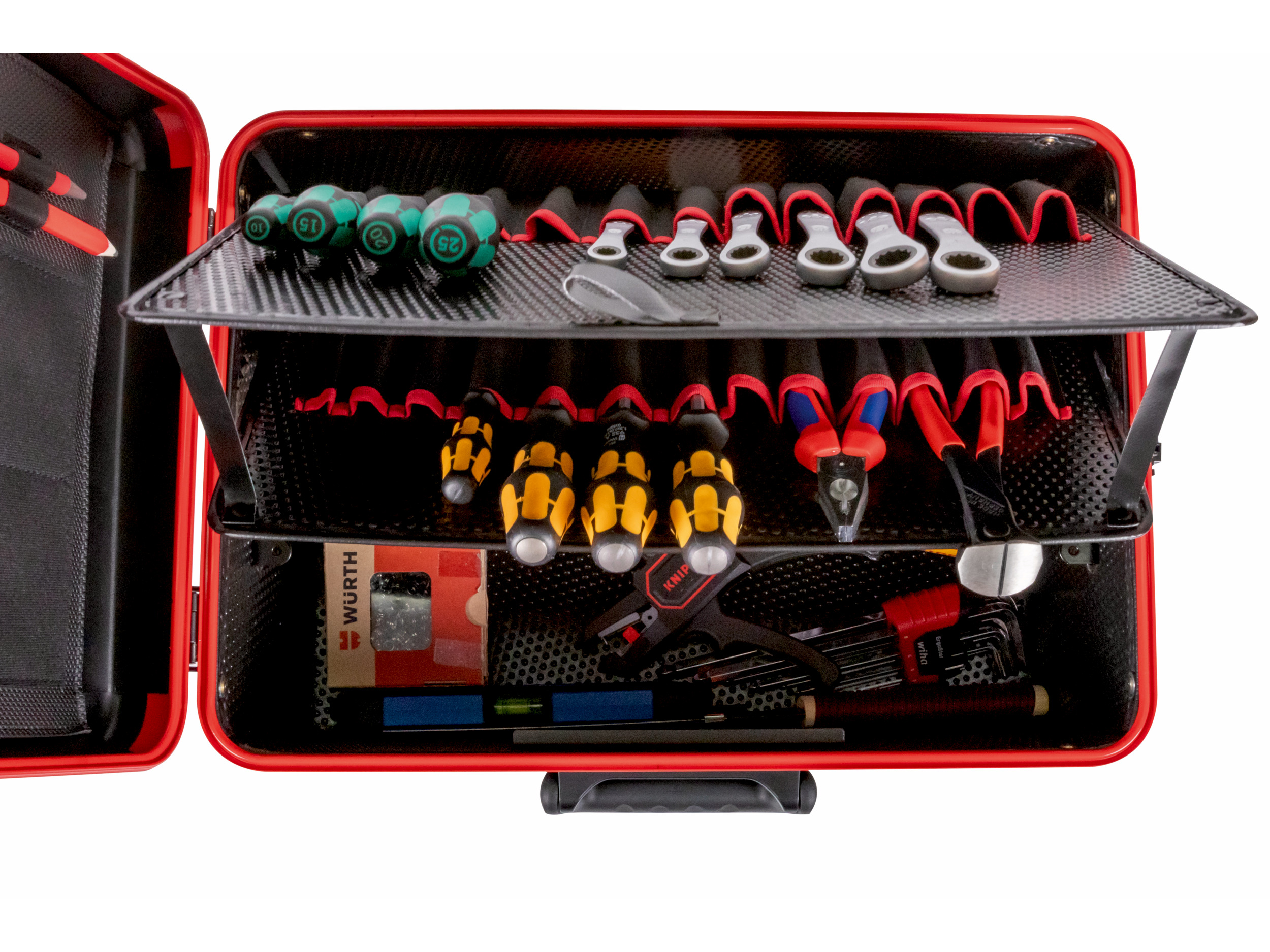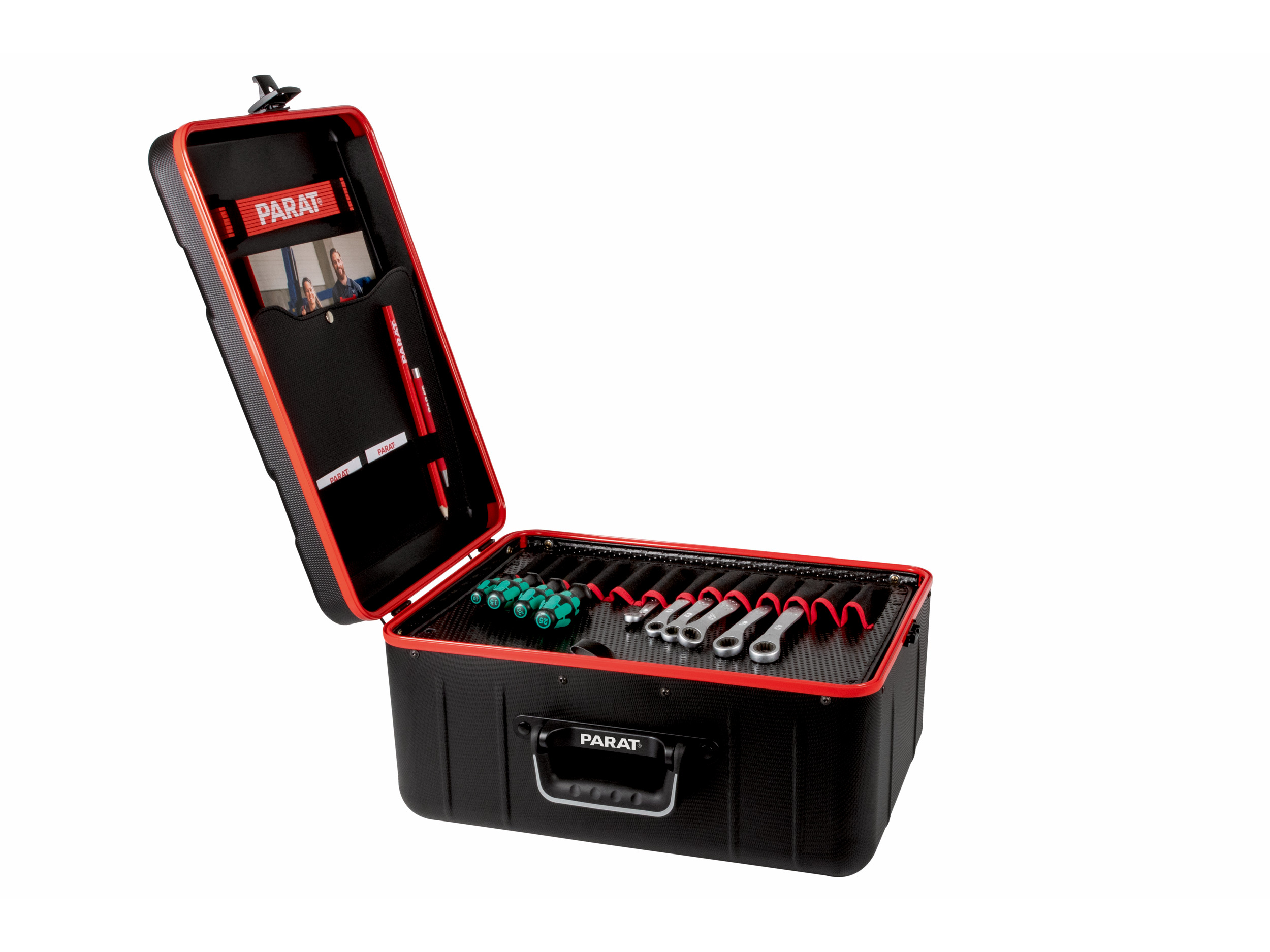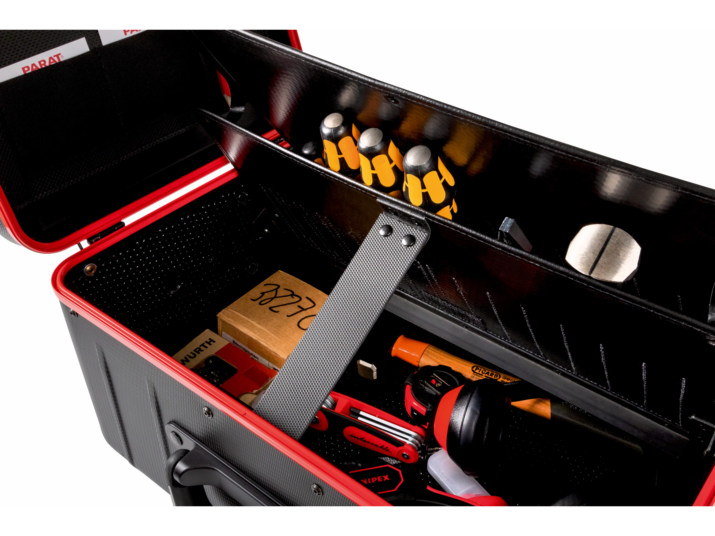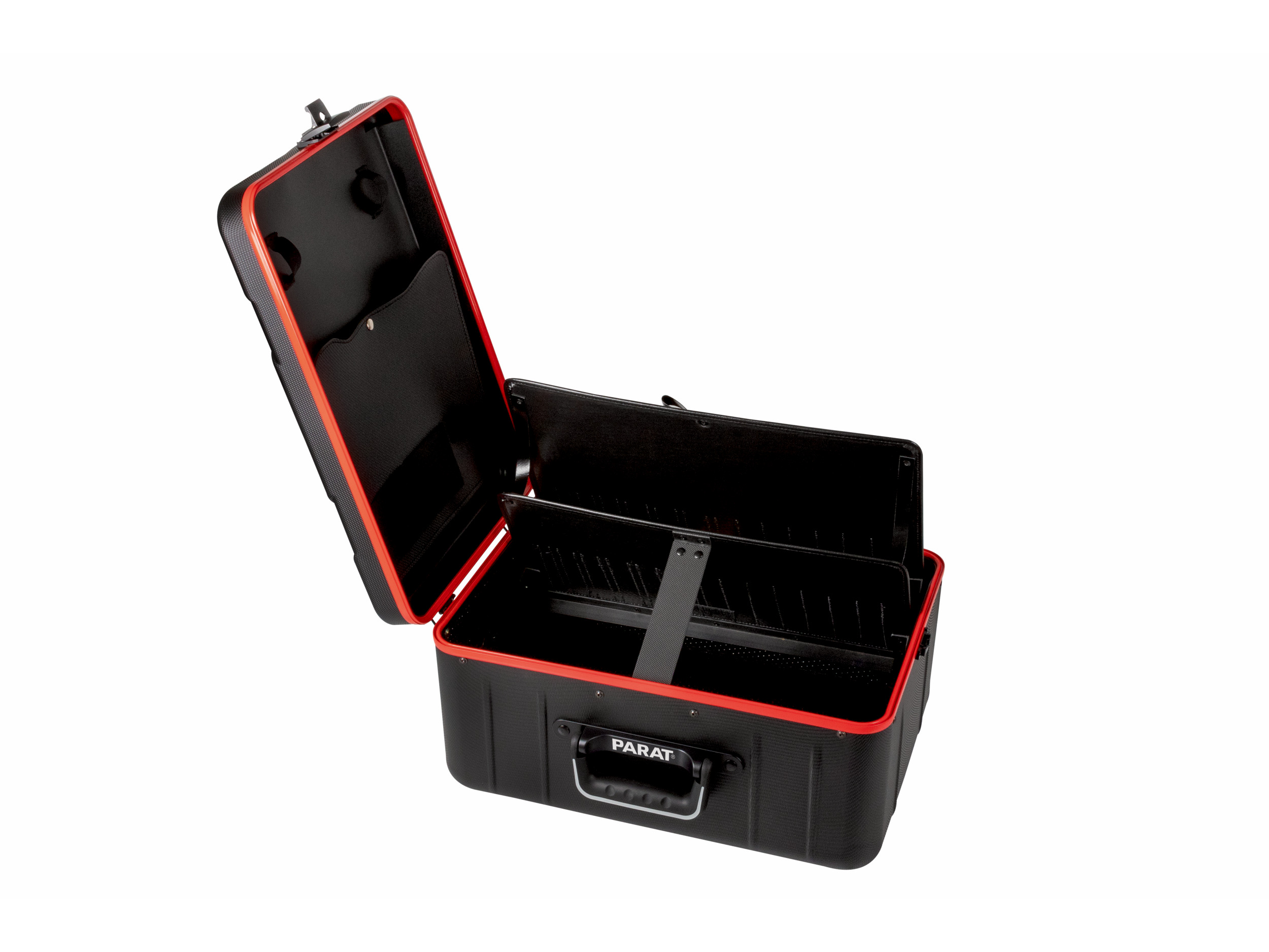 Onze nieuwe PARACTIVE-lijn biedt innovatieve gereedschapsopslag. De koffer heeft een opvallend rood Aluminium frame en een slipvaste, duurzame X-ABS-plastic buitenkant. De PARACTIVE 35 S bevat twee gereedschapspanelen met elk 13 insteekvakken van nylon en Con-Pearl®-materiaal. De 120 mm hoge bodembak biedt ruimte voor grote gereedschappen. De opslagcapaciteit is 35 liter. De scharnierende bodembak geeft snelle toegang. Het deksel heeft lussen voor een duimstok, een documentenvak, twee visitekaarthouders en potloodlussen. Glijders beschermen oppervlakken. Het ergonomische handvat met soft-touch en vingerinkepingen zorgt voor makkelijk dragen. Het deksel is stevig bevestigd met scharnieren en een sluitsysteem voor bescherming tegen diefstal.