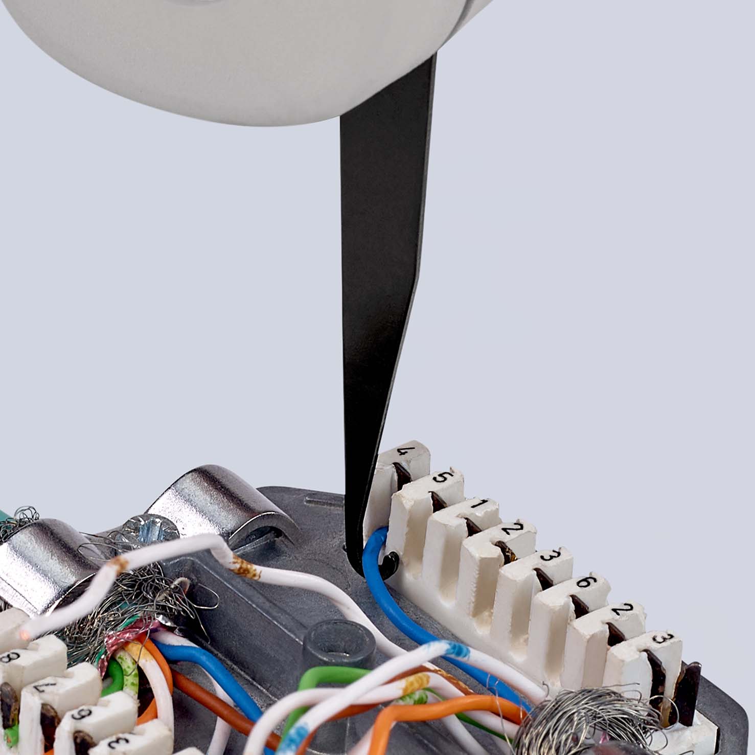 Gereedschap voor klemlijsten met snij- en klemcontacten. Indrukken en afsnijden in één beweging. voor UTP- en STP-kabels met geleider Ø 0,4 - 0,8 mm. Met geïntegreerde trekhaak en ontgrendelingspal. - Behuizing: kunststof - Toepassing: UTP- en STP-kabels, LSA-Plus en vergelijkbaar - Capaciteit (diameter): Ø 0,4 – 0,8 mm.