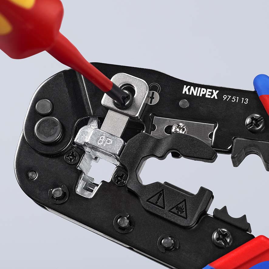 Krimptangen voor RJ45-westernstekkers Alles-in-één tool voor het knippen van kabels, strippen van ronde kabels en krimpen van gewone RJ45-stekkers. Krimpt veilig afgeschermde en niet-afgeschermde RJ45-westernstekkers (8P8C). Met verstelbare borggrendel, voor alle gangbare RJ45-stekkers met gesloten en niet-gesloten behuizing. Nauwkeurig krimpen door parallel krimpen en constant hoge krimpkwaliteit door dwangsluiting (ontgrendelbaar). Apart krimppunt voor trekontlasting (kabelclip). Snel knippen en strippen van CAT-kabels met een hoogwaardig mes. Met ergonomische meer-componenten handgrepen. voor de huidige en toekomstige westernaansluittechniek op het gebied van netwerk/ethernet, modulaire westernstekker met 8P8C-penbezetting. - : Westernstekkers.