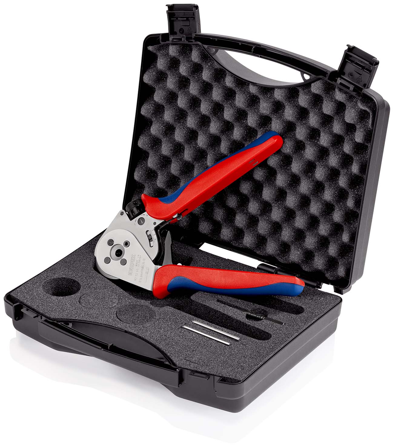 Vierdoornkrimptang voor gedraaide contacten voor het krimpen van gedraaide contacten. Vierdoornpersen voor de meest hoogwaardige krimpverbindingen. Kaliber cilinder voor de controle van de basisinstelling. Constante hoge krimpkwaliteit dankzij dwangsluiting (ongrendelbaar). Meer krachtoverbrenging door de effectieve hefboomconstructie voor moeiteloos werken. Hoog bedieningscomfort dankzij de handige bouwvorm. fijne en precieze krimpdrukinstelling op verschillende kabeldiameters met behulp van een verstelbaar wiel. positioneerhulp voor de Aansluiting van contacten. met tabel voor de berekening van de instellingswaarden. tang in een kunststof koffer met schuimrubberen voering. - Toepassing: gedraaide contacten (Harting; Ilme; Phoenix; Amphenol; Walther; HTS;Contact; Weidmüller) - Capaciteit vierkante millimeter: 0,14 — 6 mm² - AWG: 26 — 10 - Aantal krimpprofielen: 1 - Contactdiameter max.: 7,5 mm.