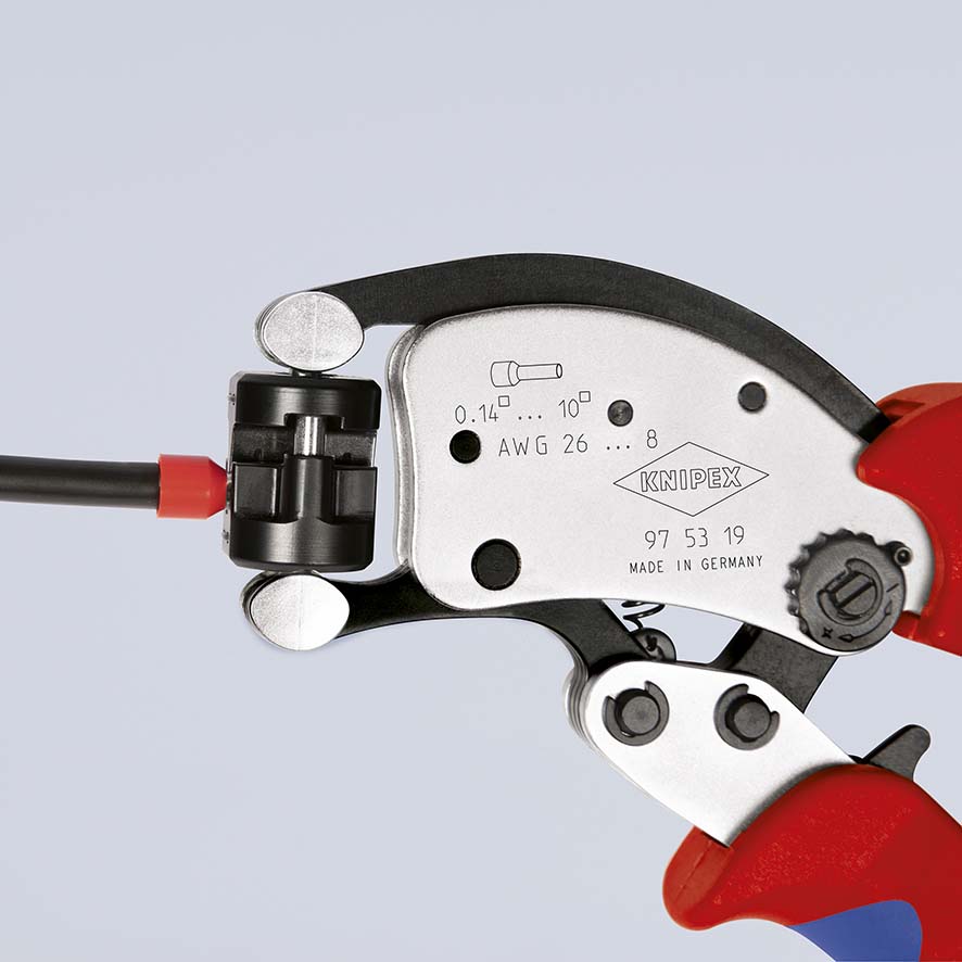 KNIPEX Twistor® T Krimpkop 360° draaibaar, met 8 insluitposities Krimpen van adereindhulzen vanuit praktisch elke werkpositie mogelijk. De krimptang stelt zich automatisch op de verschillende dwarssneden in Persen van Twin-adereindhulzen tot 2 x 6 mm² mogelijk. Constante hoge krimpkwaliteit dankzij dwangsluiting (ongrendelbaar). Licht en handig gereedschap, handkracht versterkt door kniehefboommechaniek. - AWG: 26 — 8.