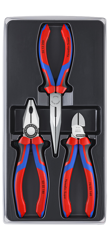 Montage-set Aantrekkelijke verkoopsverpakking met ophangoog. Gereedschappen in het kunststof verzonken met doorzichtig deksel. Afmetingen (H x B x D): 170 x 370 x 40 mm. tangen met tweekleurige meer-componentengrepen. zelfbedieningskaart/blister