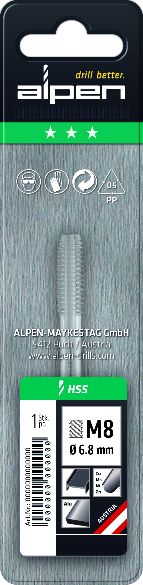 Voor doorlopende gaten schroefdraden, geschikt voor gelegeerde en ongelegeerde metalen tot ongeveer 850 N/mm², gietstaal, smeedbaar gietijzer, messing, Aluminium en koper.