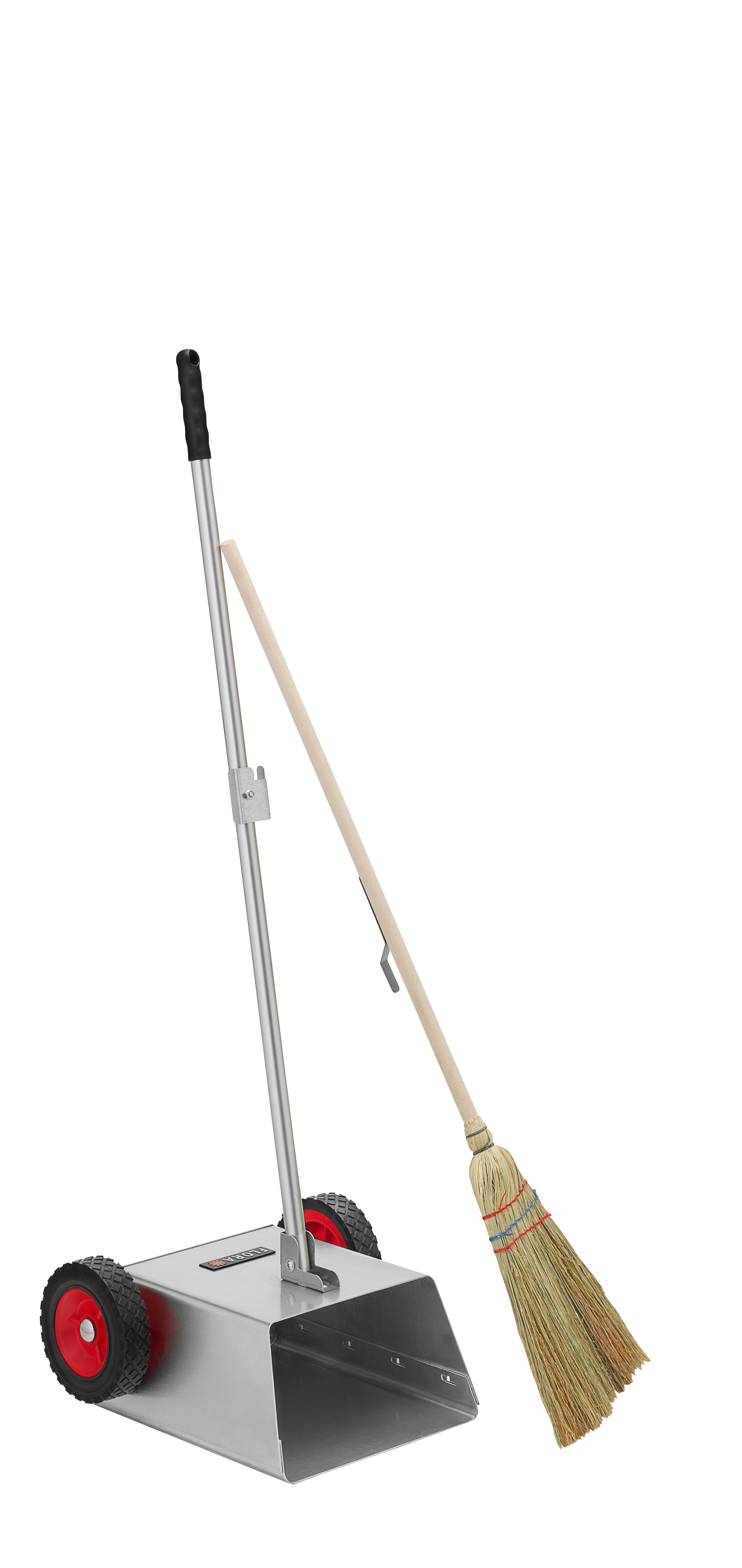 Mobiele veegkar met tilt functie en met bezem voor binnen en buiten gebruik. Gemaakt van Aluminium met plastic wielen.