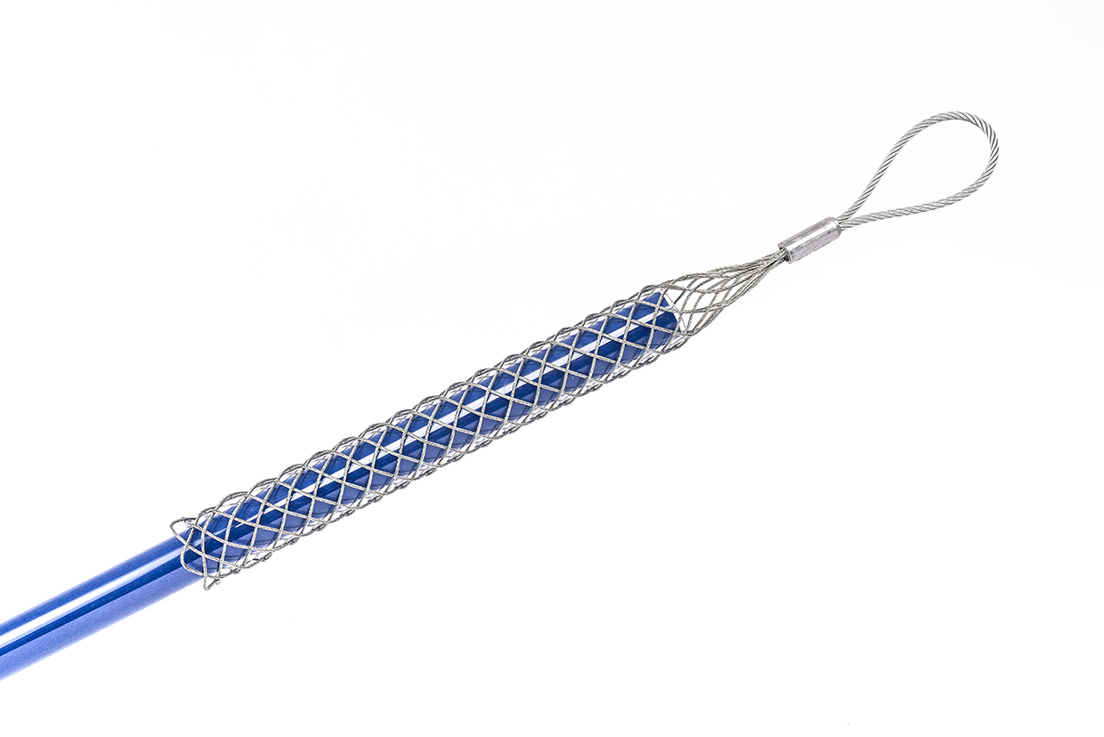 Handgeweven kabeltrekkous van gegalvaniseerd staal met een touwlus voor eenvoudige verbinding van kabels tijdens bouwinstallatie. Het uiteinde van de kous is niet gesoldeerd maar teruggeduwd naar het begin van het slipje en daar vastgedrukt met een mouw.