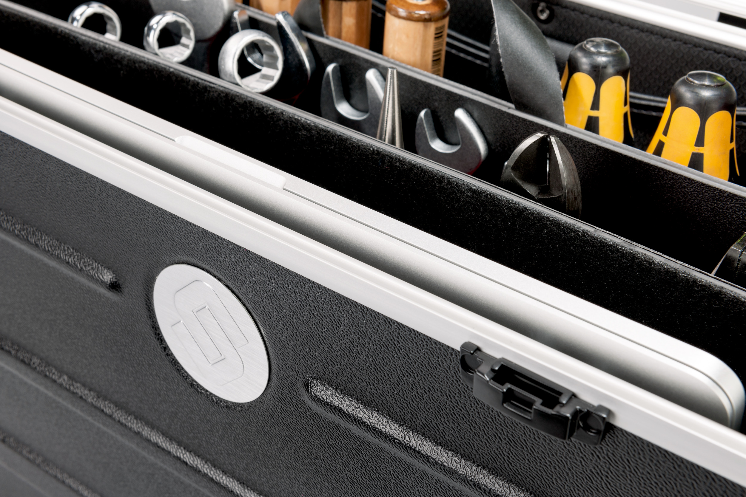 Deze gereedschap-koffer is ideaal voor moderne servicetechnici. Het robuuste ontwerp biedt opslagruimte voor laptops of tablets tot 17'', met extra ruimte voor gereedschap en accessoires. Gemaakt van slagvast X-ABS plastic met een Aluminium frame, met sloten voor veiligheid en een geïntegreerd trolleysysteem voor eenvoudig transport.