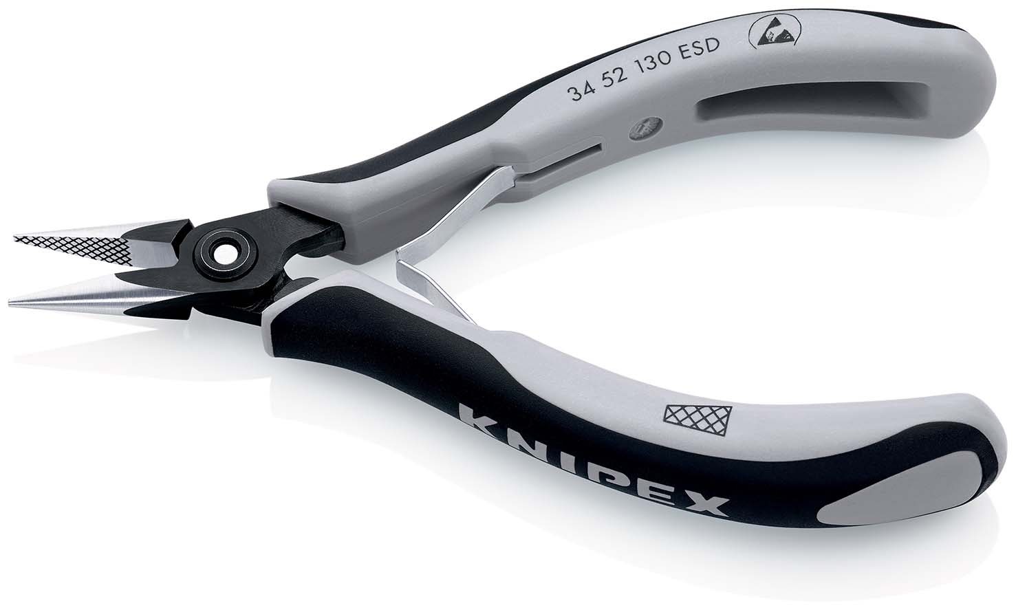 Precisie elektronicagrijptang ESD het assortiment voor de hoogste eisen qua vermogen en resultaat. precisietangen voor fijne montagewerkzaamheden bijv. in elektronica en fijne mechanica. voor grijpen, klemmen en buigen. uitvoering elektrisch afleidend - dissipatief. Precies, soepel lopend geschroefd scharnier. Precies vervaardigde scharniervlakken voor een gelijkmatige, wrijvingsarme beweging in het hele openingsbereik. Soepele, dubbele veer, waardoor de tang makkelijk en gelijkmatig opent. Met precisielaser behandeld raster. Perfecte finish. Gering gewicht. Ergonomische, tweekleurige meercompomnenten-ESD-grepen; zwart/grijs. halfronde bekken. met precisielaser behandeld raster. - Beklengte (B): 22,7 mm - Bekdikte (scharnier) (D): 6,5 mm - Puntbreedte (E): 1,6 mm - Tip Thickness (F): 1,6 mm - Kopbreedte (A): 11,2 mm - ESD: ja.