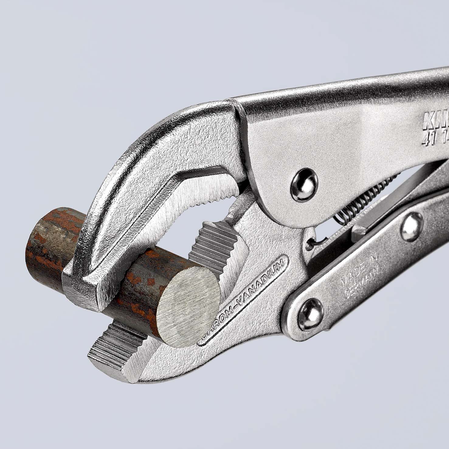 Klemtang voor het goed vasthouden van rond, vlak en profielmateriaal. Zeer belastbaar. Met stelschroef en ontgrendelingshendel. éénhandbediening. Grote spankracht door kniehefboomoverbrenging. - Spanwijdte rond: 36 mm - Spanwijdte 4-kant: 36 mm - Spanwijdte 6-kant: 36 mm.