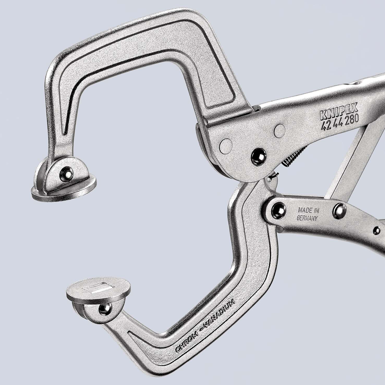 Las-klemtang voor het klemmen, vastspannen en vasthouden van verschillende profielen. Zeer belastbaar. Met stelschroef en ontgrendelingshendel. éénhandbediening. Grote spankracht door kniehefboomoverbrenging. met beweeglijke bekken. grijpbekken uit chroom-vanadiumstaal, matrijsgesmeed. spant moeilijk te manoeuvreren werkstukken en profielen met hoge verbindingen tot 40 mm. - Spanwijdte 4-kant: 90 mm.