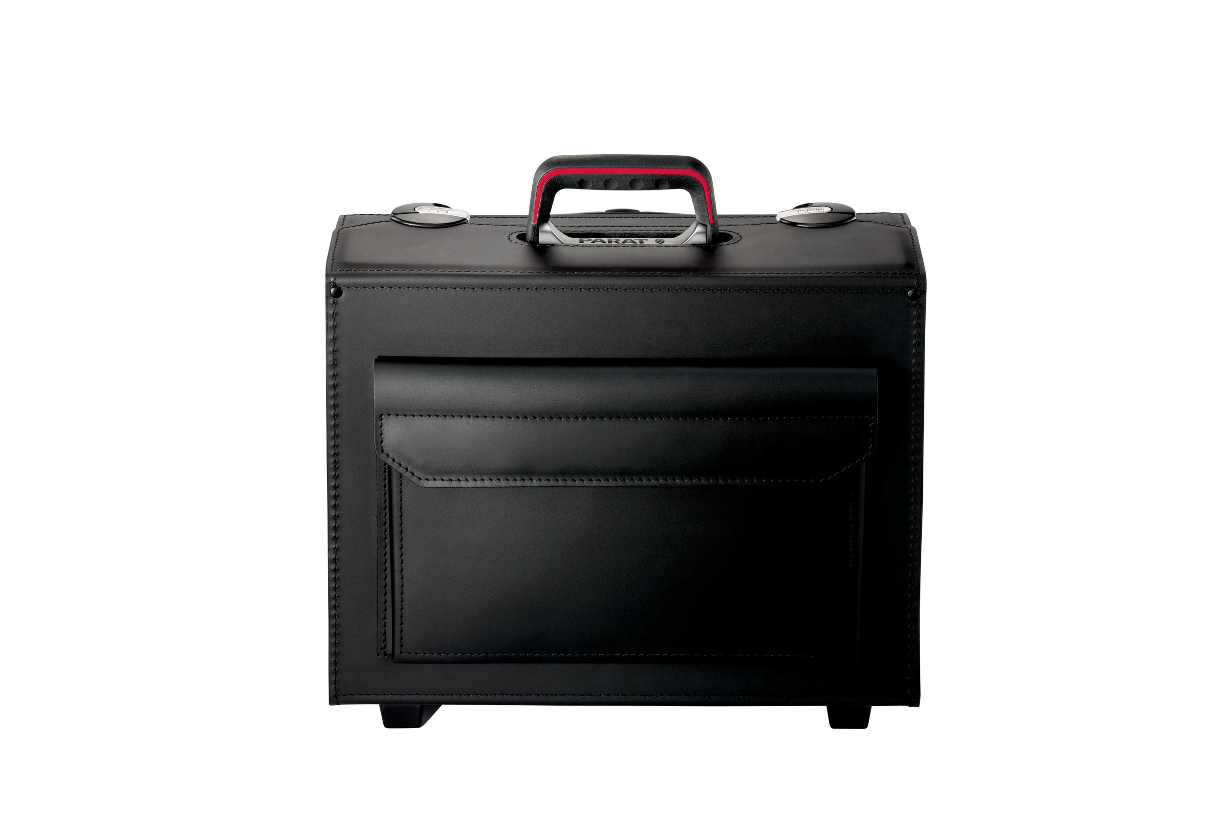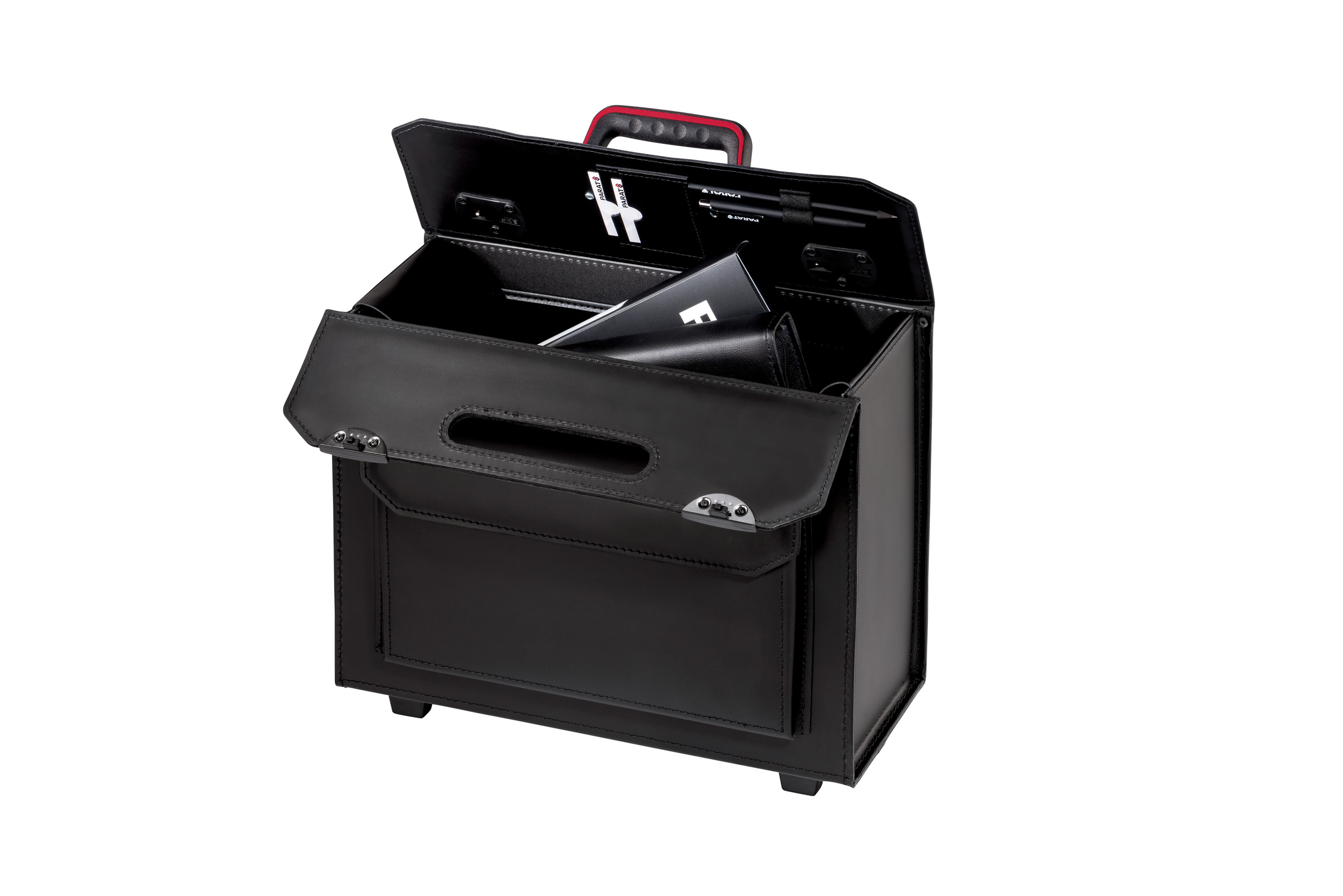 De premium Paradoc Pilotenkoffer bestaat uit robuuste, schokbestendig leer. De tijdloze roller koffer is ideaal voor gebruik in het kantoorgebied. Het bevat mappen en documenten, een afzonderlijk opgevuld notebookvak (ongeveer 425x50x285mm). Twee cijfersloten beschermen de inhoud van de Paradoc Pilotenkoffer tegen ongeautoriseerde toegang en tegen diefstal. Mappen kunnen in dit geval worden getransporteerd. elastische banden en visitekaartjesinsteekvakken bieden extra ruimte. Het heeft een volume van ongeveer 26 liter en is ongeveer 5,4 kg. De geïntegreerde trolley wielen zorgen voor eenvoudig en comfortabel transport.