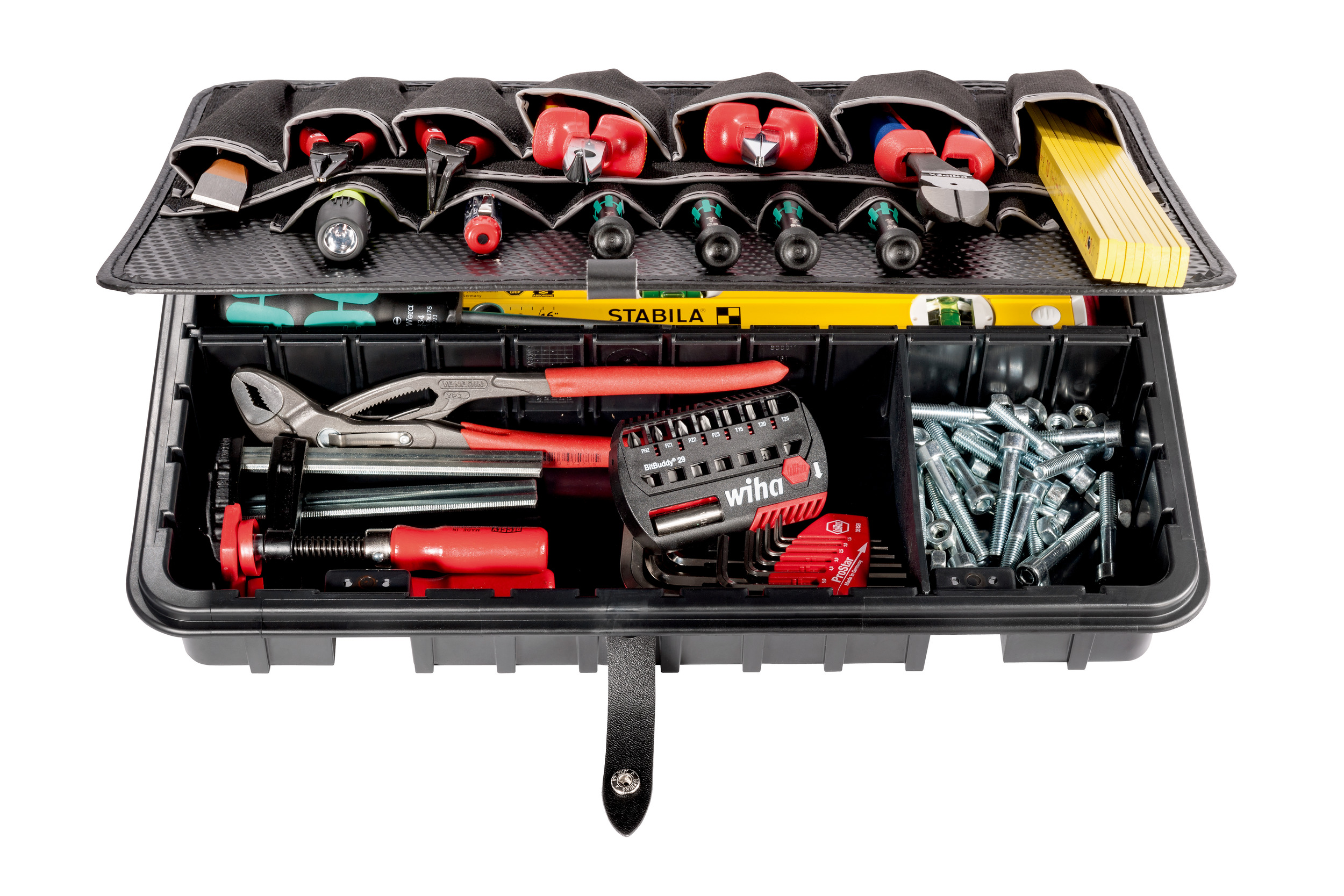 De hoogwaardige zwarte bodemschaal gemaakt van ABS-plastic zorgt voor systeem in de gereedschapszaak. Accessoires en gereedschappen kunnen duidelijk worden gesorteerd en getransporteerd naar een van de 15 pluggen.