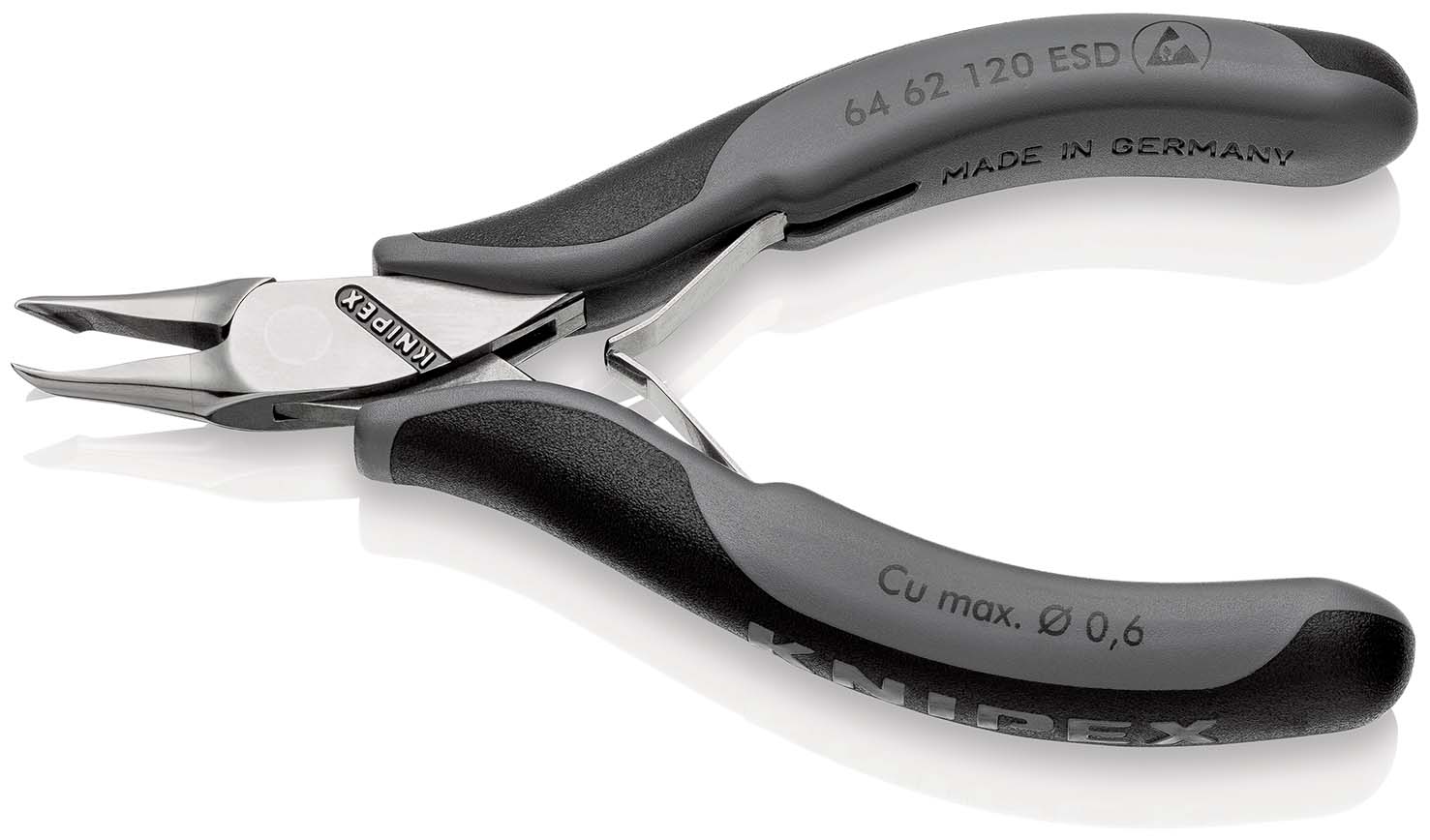 Elektronica-voorsnijtangen ESD precisietangen om zeer fijn te knippen bijv. in elektronica en fijnmechanica. uitvoering elektrisch afleidend - dissipatief. Doorgestoken precisiescharnier. Soepele, dubbele veer, waardoor de tang makkelijk en gelijkmatig opent. De spiegelpolijsting biedt samen met een fijne oliefilm een optimale bescherming tegen roest - geen storingen in het schakelcircuit door wegspringende chroomsplinters. Snijkanten bijkomend laserverhard, hardheid van de snijkanten minstens 56 HRC. Benen met tweekleurige meer-componentengrepen zwart/grijs. voorsnijtang met schuine kop, mini-snijkant met klein facet, α=55°. - Snijcapaciteiten zachte draad (diameter): Ø 0,6 mm - Kopbreedte (A): 11 mm - Beklengte (B): 20 mm - Bekdikte (scharnier) (D): 7 mm - Meslengte mm (C): 7 mm - ESD: ja.