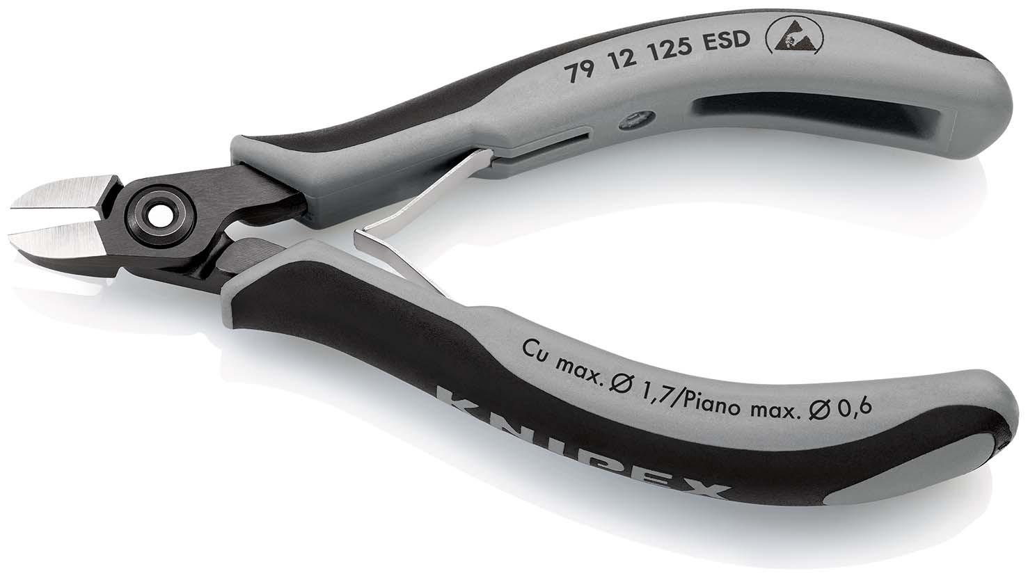Precisie elektronica-zijsnijtang ESD uitvoering elektrisch afleidend - dissipatief. precisietangen om zeer fijn te knippen bijv. in elektronica en fijnmechanica. Precies geslepen, scherpe snijkanten met zeer kleinen facetten voor exacte snijresultaten op gevoelige elektronische componenten; ook zonder facet voor verzonken snijwerkzaamheden. Precisie-snijkanten extra inductief gehard, hardheid van de snijkanten ca. 64 HRC. Ca. 20% minder gewicht dan gewone elektronische tangen. Geschroefd scharnier met precies vervaardigde scharnier-vlakken voor een gelijkmatige, wrijvingsarme beweging in het hele openingsbereik. Soepele dubbele veer waardoor de tang makkelijk en gelijkmatig opent. Ergonomische geoptimaliseerde meercomponenten handgrepen. speciaal voor het knippen van harde draad en pianodraad. - Snijcapaciteiten half harde draad (diameter): Ø 1,3 mm -Snijcapaciteiten pianodraad (diameter): Ø 0,6 mm - Snijcapaciteiten zachte draad (diameter): Ø 0,3–1,7 mm - Beklengte (B): 10 mm - Bekdikte (scharnier) (D): 6,5 mm - Kopbreedte (A): 11 mm - ESD: ja.