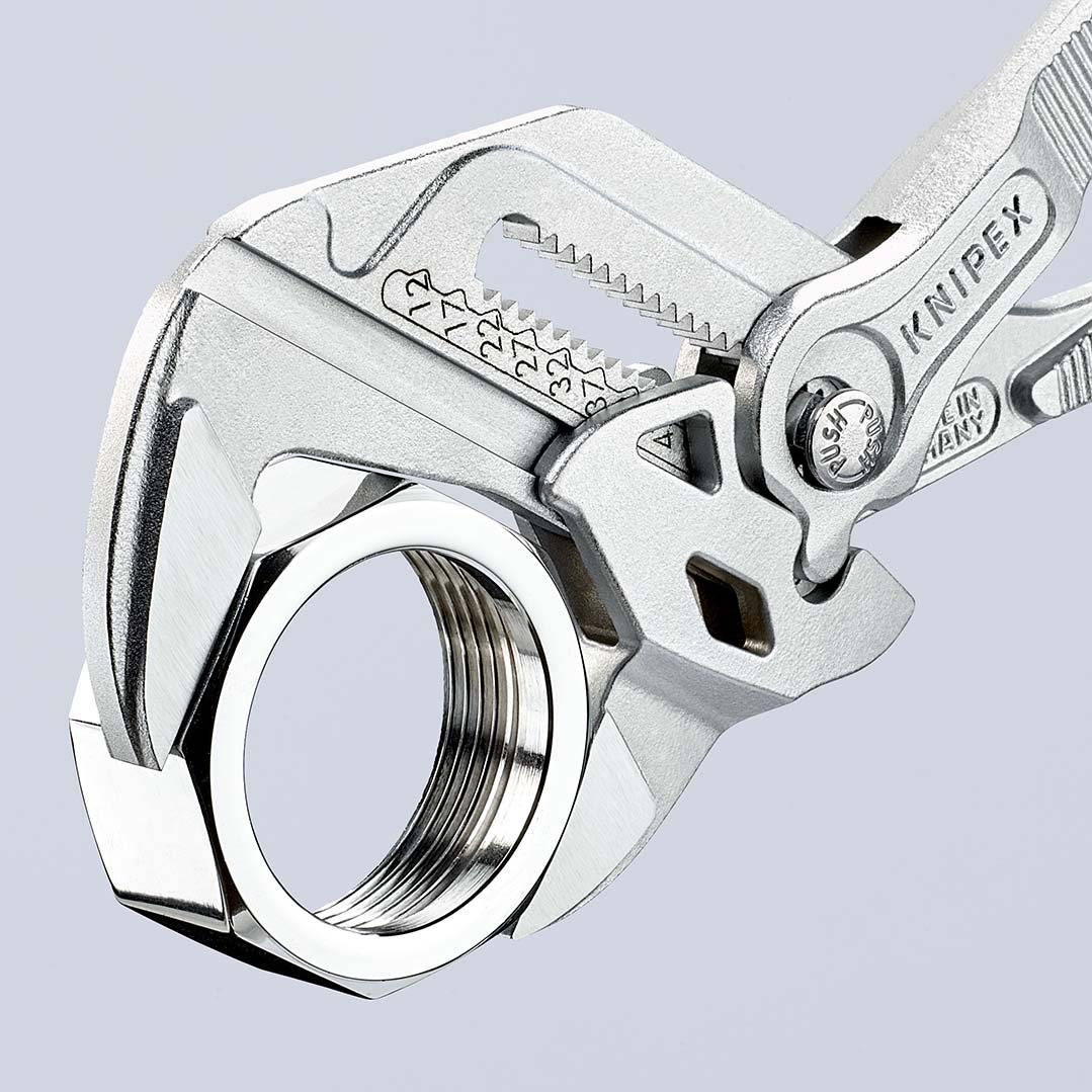 Sleuteltang vervangt een set schroefsleutels, metrisch en inch. gladde bekken voor de voorzichtige montage van oppervlakte veredelde armaturen - kan direct gebruikt worden op verchroomde delen!. Ook uitstekend geschikt voor het grijpen, klemmen, aandrukken en buigen van werkstukken. Geen beschadiging van de kanten bij gevoelige armaturen dankzij de spelingsvrije drukvlakken van de bekken. Snelle instelling door druk op de knop direct op het werkstuk. Geen ongewilde verstelling van de klembekken en geen doorschieten van het scharnier. Traploos klemmen van alle sleutelwijdtes tot de aangegeven capaciteit d.m.v. parallel staande bekken. De slag tussen de grijpbekken maakt een snel aantrekken en losmaken van schroefverbindingen mogelijk volgens het ratelprincipe. Hoge klemkracht dankzij 10-voudige krachtoverbrenging. zelfbedieningskaart/blister. - Bekdikte (scharnier) (B2): 8,0 mm - Joint Thickness (B3): 14,0 mm - Tip Thickness (B1): 8,0 mm - Instelposities: 19 - Capaciteit voor moeren (sleutelwijdte): Ø 2 - Capaciteit voor moeren (sleutelwijdte): 52 mm.