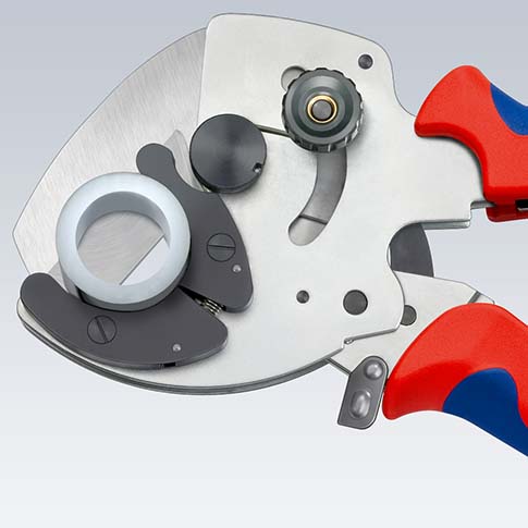 Pijpsnijder voor het knippen van kunststof- en koppelingsbuizen met dikke randen. Knipt buizen volgens het ratelprincipe door meerdere slagen. Met beweegbare bekken zodat door een juiste fixatie de buis in een rechte hoek kan worden afgesneden. - Meslengte: 40 mm.