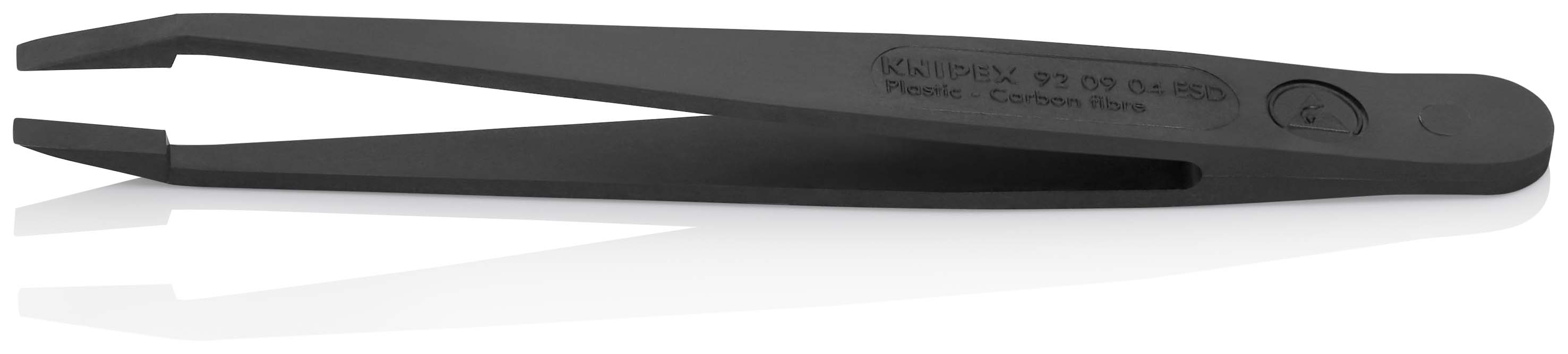 Kunststofpincet ESD Verkrijgbaar als herbruikbare ESD- of wegwerpvariant. ESD-pincetten zijn gemaakt van 30% koolstofvezelversterkte kunststof, geleiden zowel elektrisch als thermisch zeer goed en kenmerken zich door een hoge slijtvastheid en krasvastheid. Alleen ESD-versies: met een oppervlakteweerstand tussen 10^2 en 10^4 ohm voor de gecontroleerde vereffening van potentiaalverschillen tussen de gebruiker en elektronische componenten. Kunststof ESD-pincetten zijn temperatuurstabiel tot 130 °C en op korte termijn mogelijk tot 190 °C. De met koolstofvezel versterkte kunststof van de ESD-varianten is volledig elastisch, materiaalmoeheidsbestendig, trillingsdempend en waterafstotend, met een goede chemische bestendigheid tegen de meeste oliën, vetten, brandstoffen en apolaire oplosmiddelen. Kunststof ESD-pincetten zijn ideaal voor werkzaamheden aan gevoelige elektronische, micromechanische, glazen en keramische componenten, waarbij er zo zacht mogelijk moet worden omgesprongen met het oppervlak van deze componenten. Kunststof ESD-pincet: ook verkrijgbaar als set (92 00 05 ESD). - Oppervlak: gematteerd - uitvoering: rechte - Puntbreedte (A): 0,12 mm - Puntbreedte (B): 3,3 mm - Puntbreedte (C): 11,5 mm - uitvoering pincetpunt: stomp - Corrosiebestendig: ja - Weerstand tegen zuren: zeer goed - ESD-getest: ja - VDE-gekeurd: nee - Branches: Elektronika - Magnetisch: niet-magnetiseerbaar (100%) - Gedrag: elektrisch afleidend.
