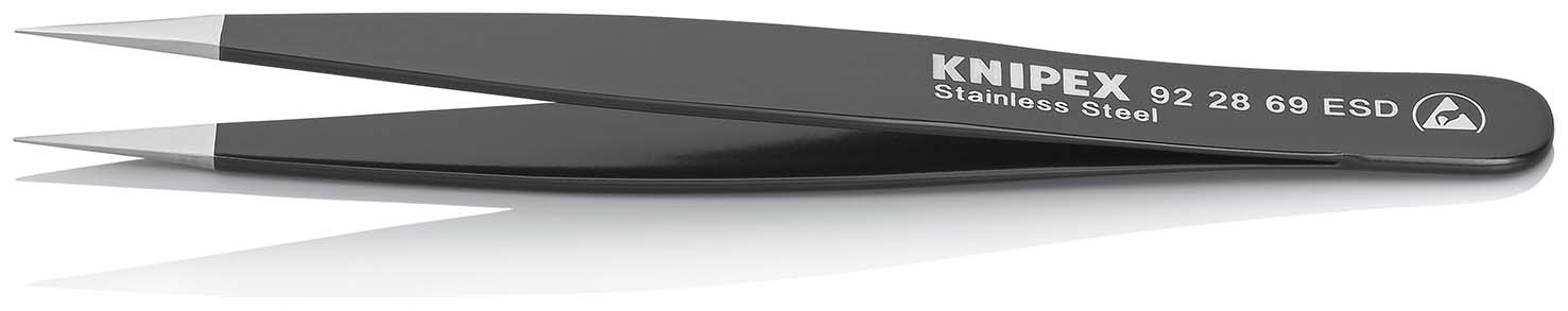 Universele pincetten ESD voor een veilige omgang met elektronische componenten bij fijne toepassingen: zorgen voor een gecontroleerde vereffening van potentiaalverschillen tussen gebruiker en component. ESD-geteste, zwarte epoxycoating met een oppervlakteweerstand tussen 10^3 en 10^9 ohm. voor de elektronica- en fijnmechanische branche. Antimagnetisch, om elektromagnetische schade te voorkomen. Groot aantal modellen: recht, schuin, gladde of gekartelde grijpvlakken en handgrepen, met naaldpunten, spitse of stompe punten. Het hoogwaardige roestvrij staal biedt een hoge duurzaamheid en een zeer goede corrosiebestendigheid tegen verschillende atmosferische omgevingen en veel bijtende materialen. Ook verkrijgbaar als set (92 00 01 ESD). - Oppervlak: gematteerd - uitvoering: rechte - Puntbreedte (A): 0,25 mm - Puntbreedte (B): 0,25 mm - uitvoering pincetpunt: naaldspits - Corrosiebestendig: ja - Weerstand tegen zuren: zeer goed - ESD-getest: ja - VDE-gekeurd: nee - Branches: Elektronika - Magnetisch: niet-magnetiseerbaar (80%) - Gedrag: elektrisch afleidend.