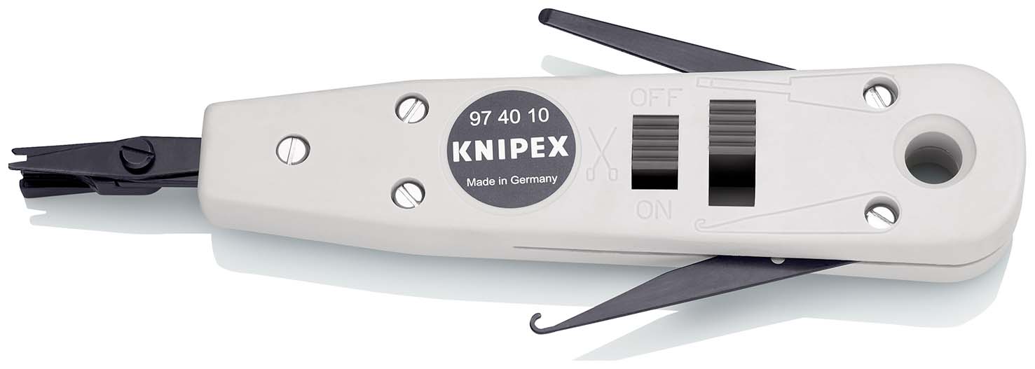 Gereedschap voor klemlijsten met snij- en klemcontacten. Indrukken en afsnijden in één beweging. voor UTP- en STP-kabels met geleider Ø 0,4 - 0,8 mm. Met geïntegreerde trekhaak en ontgrendelingspal. - Behuizing: kunststof - Toepassing: UTP- en STP-kabels, LSA-Plus en vergelijkbaar - Capaciteit (diameter): Ø 0,4 – 0,8 mm.