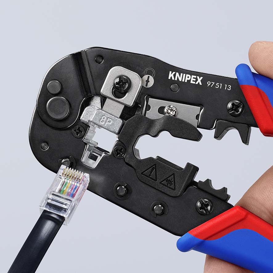 Krimptangen voor RJ45-westernstekkers Alles-in-één tool voor het knippen van kabels, strippen van ronde kabels en krimpen van gewone RJ45-stekkers. Krimpt veilig afgeschermde en niet-afgeschermde RJ45-westernstekkers (8P8C). Met verstelbare borggrendel, voor alle gangbare RJ45-stekkers met gesloten en niet-gesloten behuizing. Nauwkeurig krimpen door parallel krimpen en constant hoge krimpkwaliteit door dwangsluiting (ontgrendelbaar). Apart krimppunt voor trekontlasting (kabelclip). Snel knippen en strippen van CAT-kabels met een hoogwaardig mes. Met ergonomische meer-componenten handgrepen. voor de huidige en toekomstige westernaansluittechniek op het gebied van netwerk/ethernet, modulaire westernstekker met 8P8C-penbezetting. - : Westernstekkers.