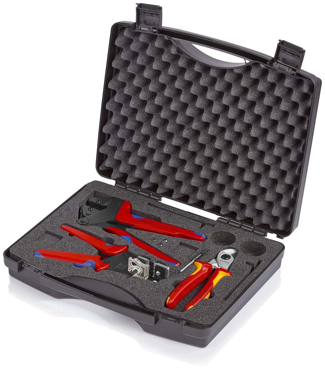 Gereedschapskoffer voor fotovoltaïek met gereedschap voor de fotovoltaïek. Met precisie afstriptang 12 12 12 met precisie geslepen messen voor grotere afstripcapaciteiten 4,0 / 6,0 / 10,0 mm². met kabelschaar 95 16 165 voor Cu-kabels tot Ø 15 mm. Met krimp-systeemtang 97 43 200 A voor verwisselbare krimpprofielen; de krimpdruk is in de fabriek exact ingesteld (gekalibreerd). Zonder krimpinzetstukken - voor individuele uitrusting - gelieve separaat te bestellen (zie art.-nr. 97 49). Met Gereedschap (binnenzeskantsleutel) om de krimpprofielen te vervangen. Stootvaste kunststof koffer. Schuimrubberen voering met uitsparingen voor de gereedschappen, krimpprofielen (niet inbegrepen) en positioneerhulpen. Buitenmaat (B x H x D): 345 x 80 x 280 mm. Leveromvang: 1 x 12 12 12 KNIPEX Precisie afstriptang met precisie geslepen messen (4,0-10,0 mm²), 1 x 95 16 165 Knipex Kabelschaar (Ø 15 mm / 50 mm²), 1 x 97 43 200 A KNIPEX Krimp-systeemtang voor verwisselbare krimpprofielen,.
